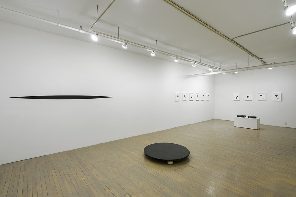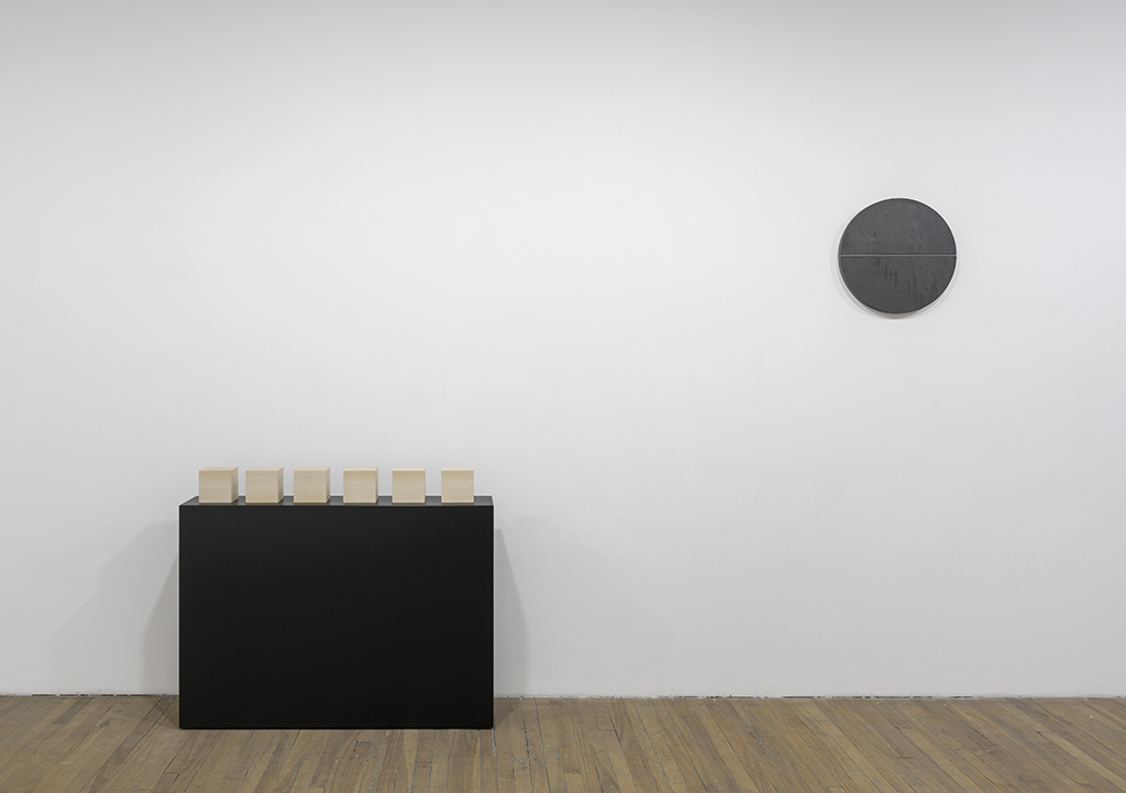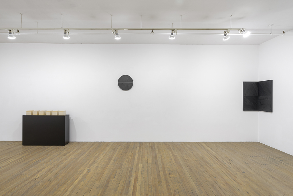 Twelve slate pieces travel across the walls and floor of the gallery space, defying or obeying gravity as they go. The slate works are complemented by a set of drawings, two slim ash laths, and a group of