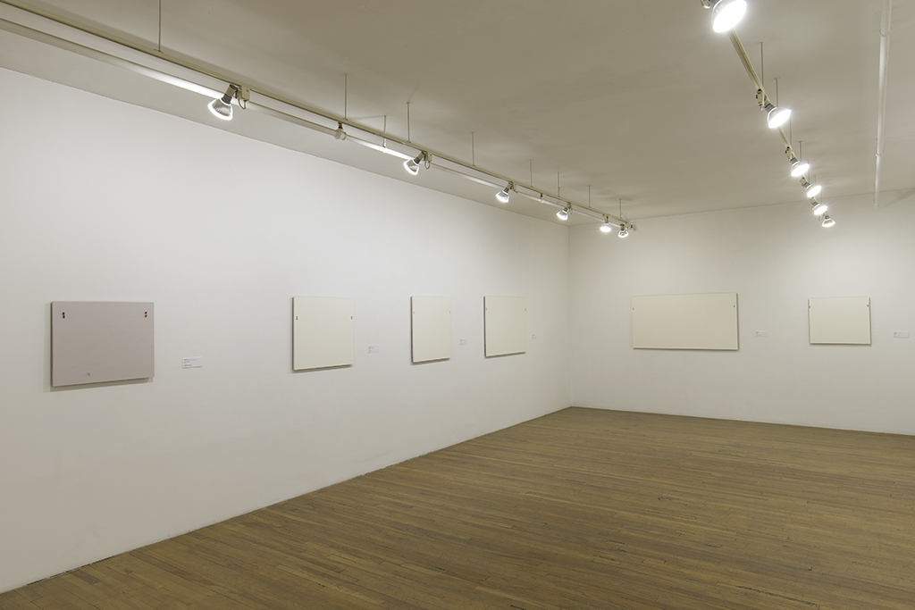 Au premier regard, les fragments monochromes de Mathieu Grenier – prélevés directement des murs du Musée d’art de Joliette – révèlent toute la froideur clinique de l’espace blanc et aseptisé caractéristique des salles d’exposition. La perfection géométrique et la monochromie des prélèvements font de cette série la trace un peu austère – quoique ludique, aussi, dans son rapport au vide vu l’absence d’images – d’une parcelle de l’histoire de la peinture du Québec : la sélection des œuvres a été faite de manière à reproduire partiellement Au-delà des signes, l’un des volets de l’exposition de la collection permanente de l’institution joliettaine dédié à la modernité picturale.
