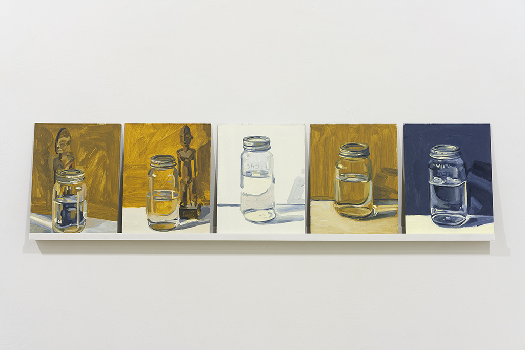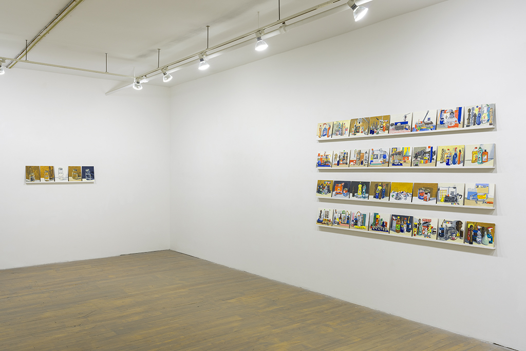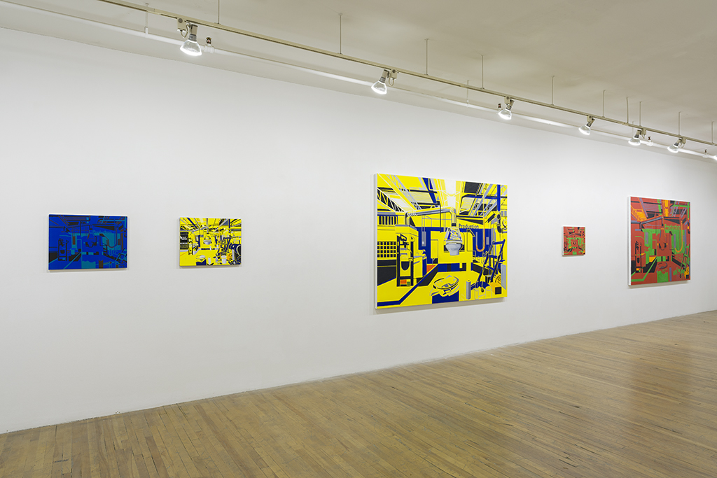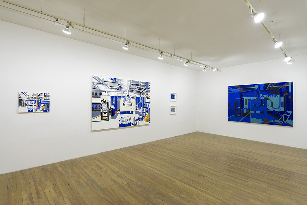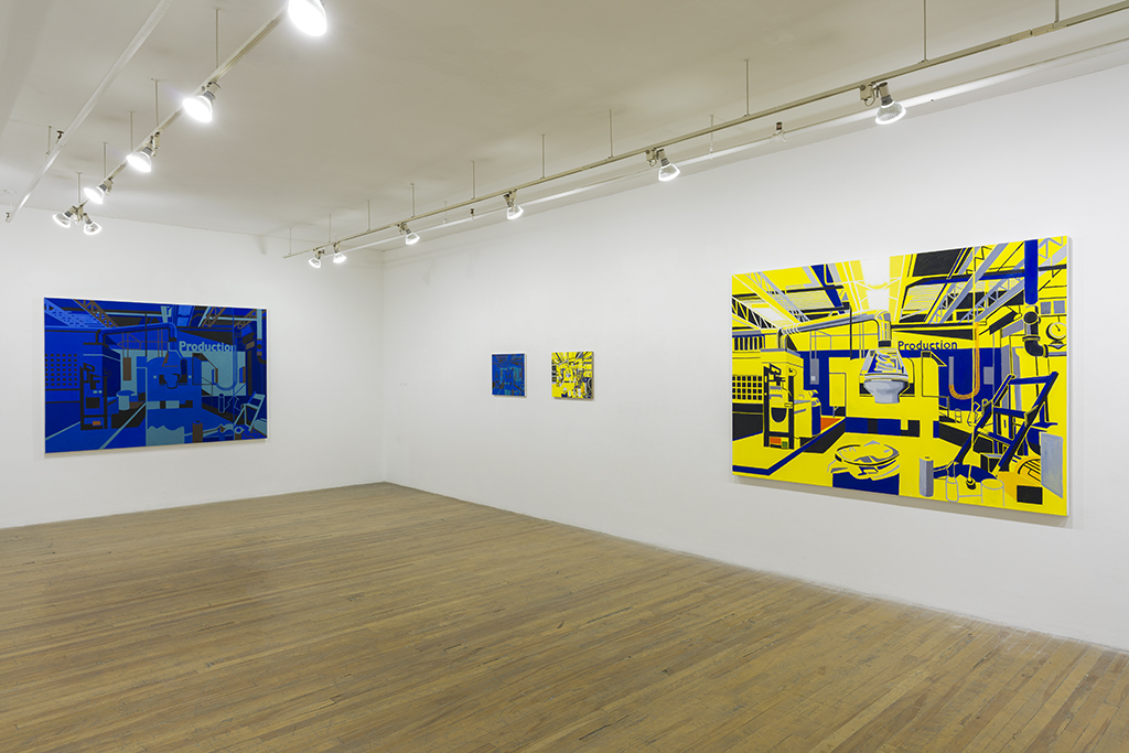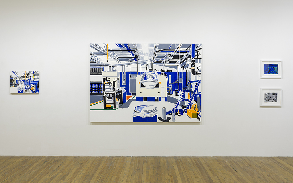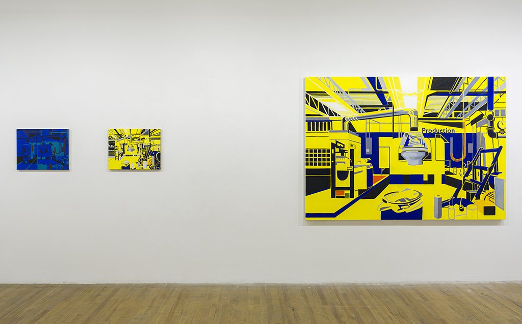 The Paint Factory project consists of a series of four paintings about the manufacturing of oil paint. Based upon documentation gathered in a paint factory, of the process of making oil paints, the paintings depict the same image rendered on a different coloured ground – white plus the primary colours, yellow, red and blue. Using the proceeding one as the model, the works become progressively further removed from the source image. While retaining their subject, they become more distilled and open to interpretation and invention.