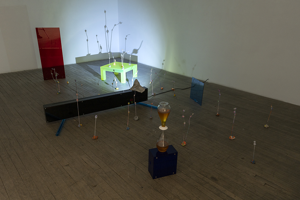 Les composantes de l’exposition ont été réalisées dans son atelier de sculpture en parallèle à la recherche plastique qu’il mène de pair avec Sarah Wendt, sa collaboratrice depuis 2015. Performeuse, plasticienne et musicienne, Wendt s’intéresse au mouvement dans l’image et à la rencontre des objets. Cette interpollinisation de leurs langages fait évoluer le travail de Dufauxpour inclure une réflexion picturale incarnée dans des techniques de conception ainsi que dans l’usage de la lumière comme matière sculpturale.