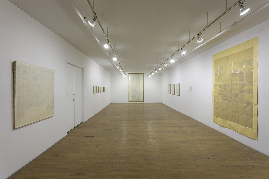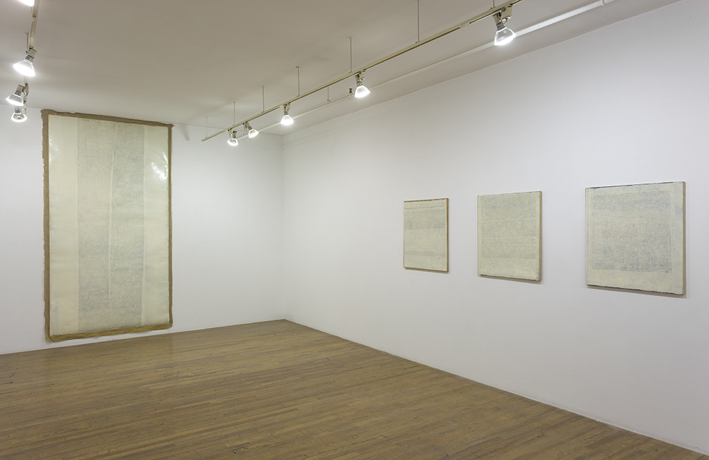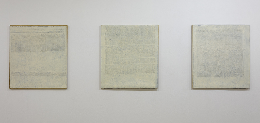 The works on paper from the “Pages” series by Romany Eveleigh approach painting and drawing as forms of written expression. Approximating the visual landscape of the ‘page’, the works make use of techniques and materials borrowed from the world of writing, printing and mechanical reproduction.