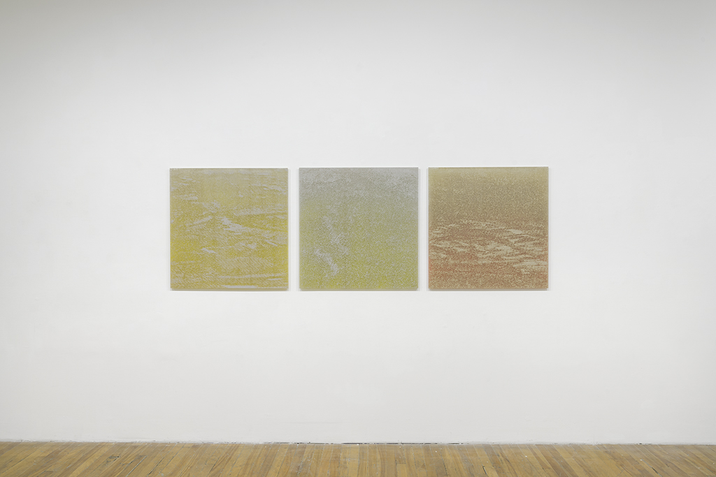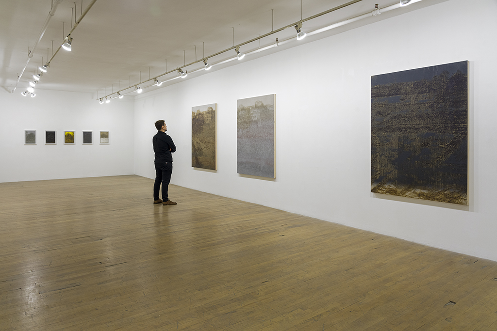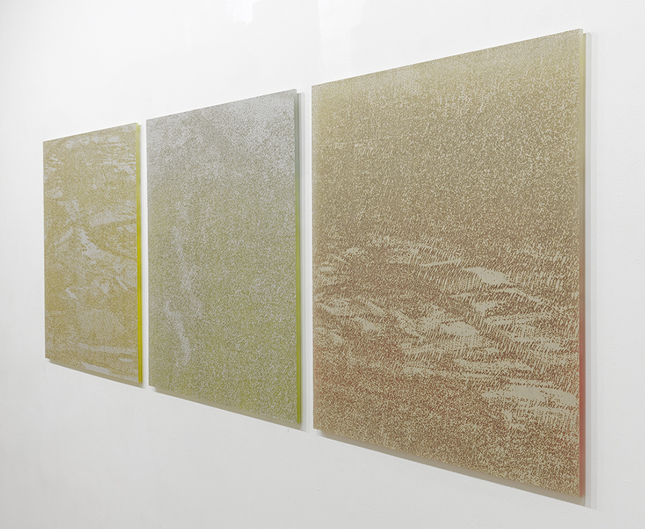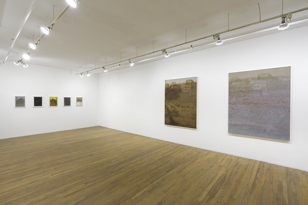 C’est en altérant la matière avec des dépôts de fumée, des grattages ou des perforations que l’artiste revisitent des procédés qui ont marqué la pratique de la peinture depuis la seconde moitié du XXième siècle. Cependant, c’est un tout autre travail que propose Bouchard en détournant ces codes dans une approche qui intègre volontairement des méthodes dites plus objectives entre science et art : réinterprétant la traduction de données géographiques portant sur les bordures de la Meuse en Belgique vers l’exercice pictural. Ramenées dans le « champ de la peinture », les données géographiques donnent à voir des « territoires enfumés » qui n’ont plus aucune prétention de visualisation objective et dont la couleur devient un élément central : « mon exploration vise à découvrir ce qui advient après les multiples transformations et traductions que je fais subir aux surfaces. La couleur ne provient jamais d’une application directe, je cherche celles qui émergent par les côtés, par les dessous ou selon mon déplacement devant le tableau en dialogue avec le contexte ».