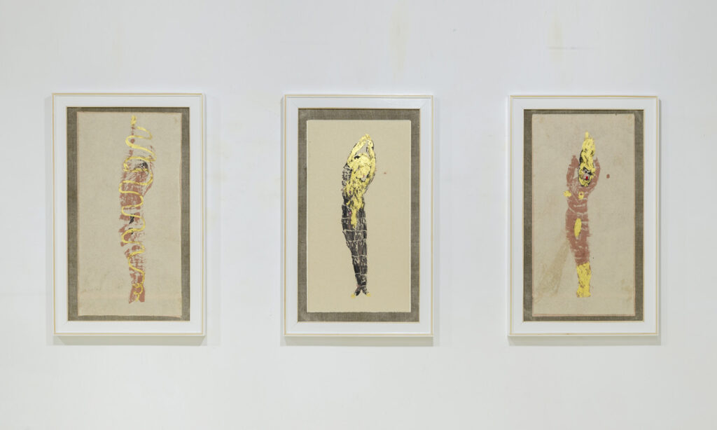 Créée il y a presque une décennie mais à peine exposée jusqu’à ce jour, la série Extinctions accueille ces considérations graves et leur donne corps en vingt tableaux-alcôves. Autant de refuges et de relais pouvant orienter un parcours de pensée sensible guidé par des titres qu’on dirait empruntés à des contes : Le sabot de la Vierge. Opale. Paysage. Spectre des couleurs. Ciel. Le coucou et la grenouille. Antidote. Chute. La pomme, l’œuf et le ginseng. Lit d’argent. Mirage. Langues en voie de disparition. Sable. Feuilles d’or. Figue de barbarie. Migrants. Horizon. Bateau. La guérison de la Terre. Que peut-on espérer de nos jours du conte et du merveilleux ?