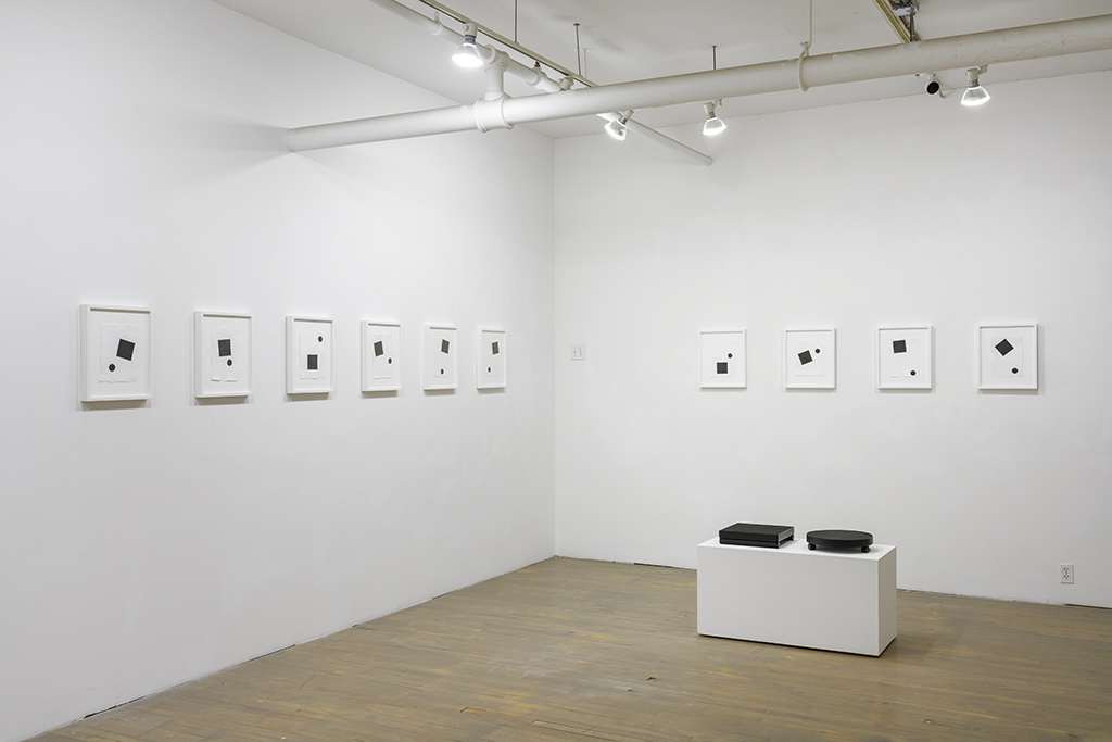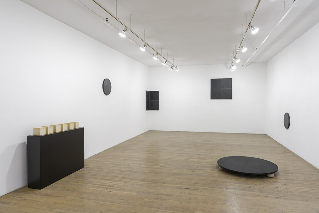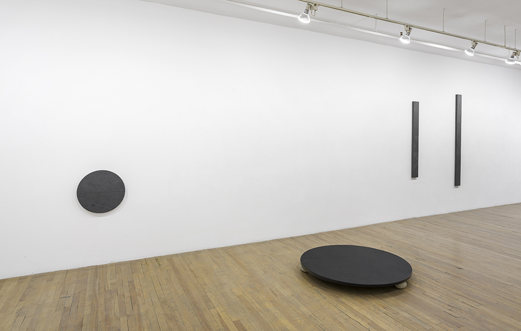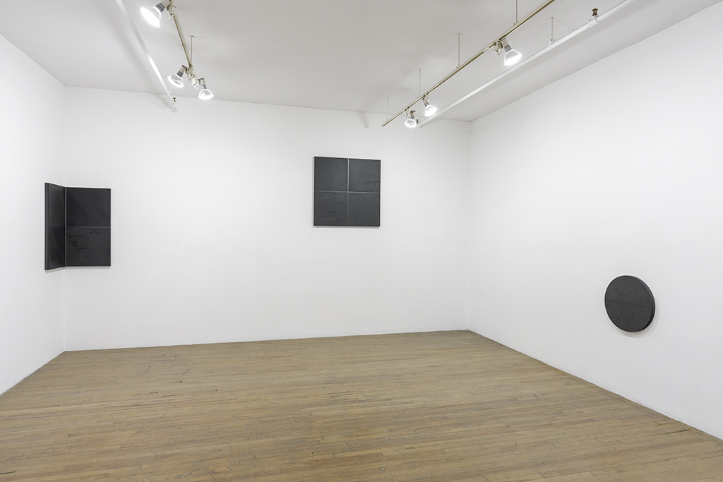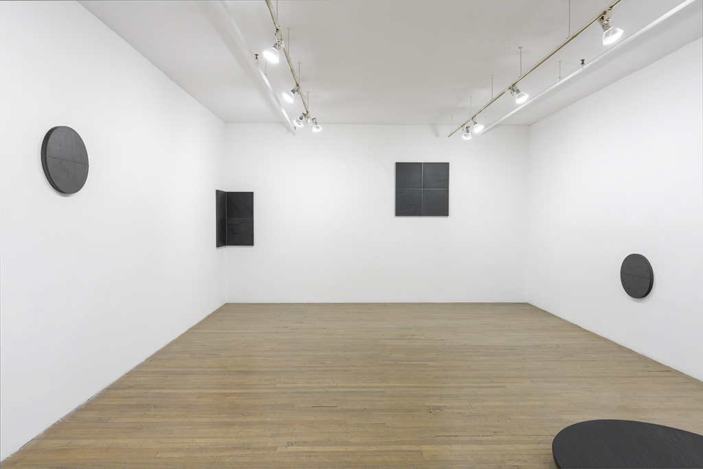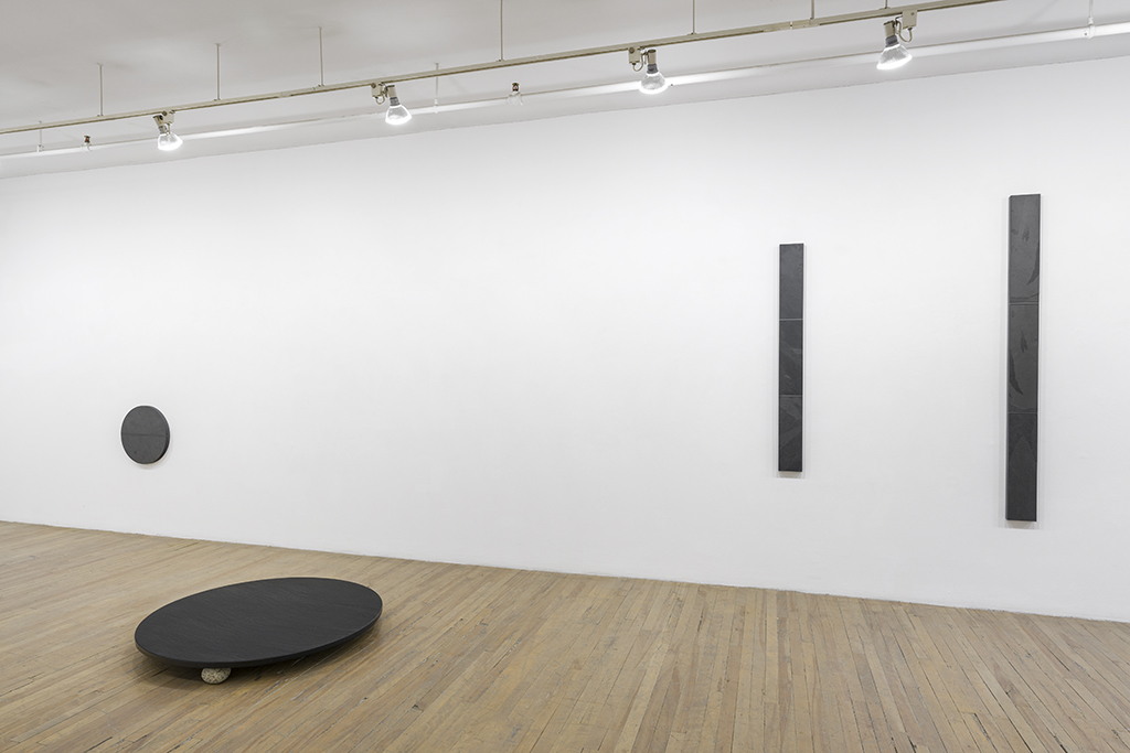 Douze œuvres en ardoise jalonnent les murs et le sol de la galerie, leur parcours défiant la gravité ou lui obéissant. Les œuvres en ardoise s’accompagnent d’un ensemble de dessins, d’un groupe de cubes en bois et de deux lattes de frêne.