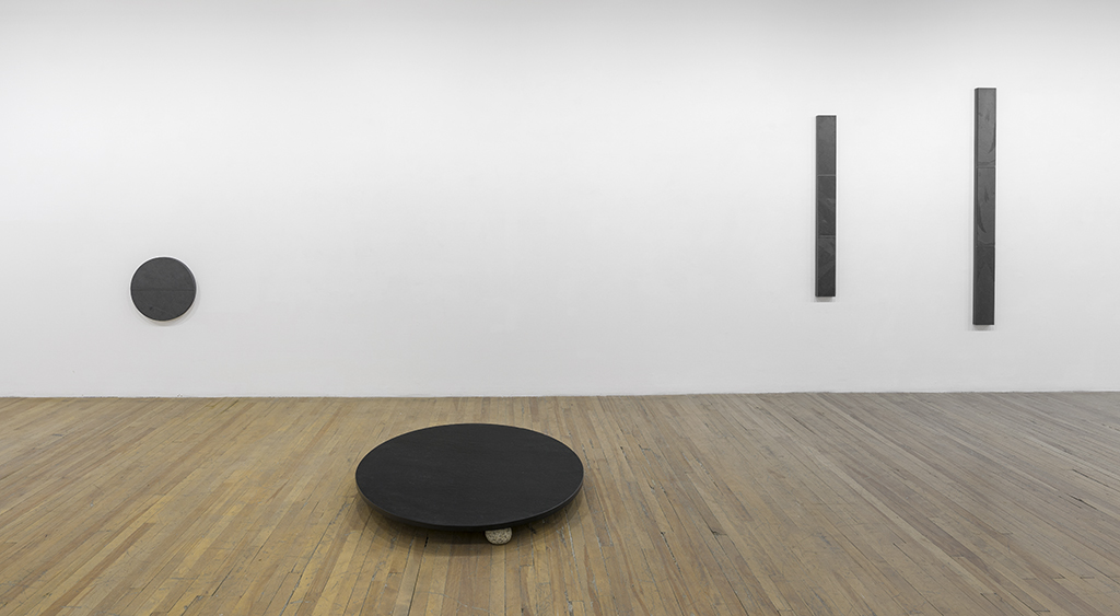 Les sculptures en ardoise foncée paraissent allégées par la façon dont elles sont disposées. C’est ce mélange entre gravité et légèreté que je cherche à incarner dans les œuvres et leur mise en place dans l’espace de l’exposition.